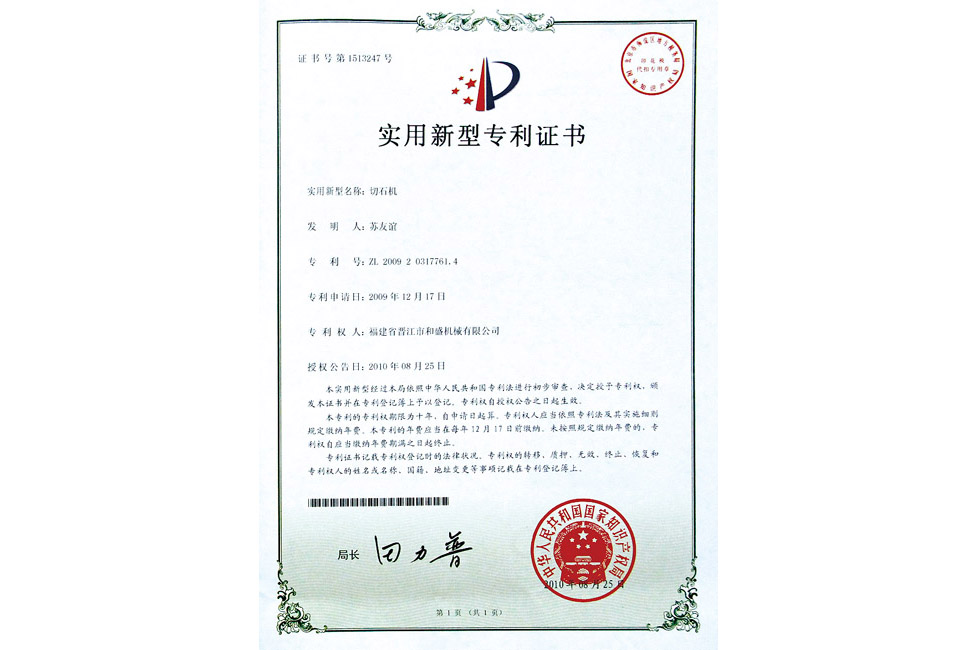 數(shù)控超薄型大板切石機(jī)實(shí)用專利證書