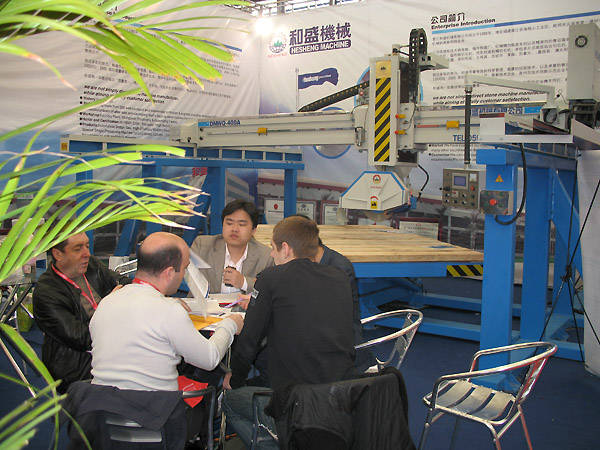 展會現場工作人員講解設備 圖片展示發布時間:2017-04-27 游覽:14444和盛石材機械專業生產石材加工成套設備;主要有石材切割機,石材拋光機,石材切邊機;異形類切機等幾大類;主產品有液壓組合切石機,液壓橋式切石機,全自動花崗巖條板磨光機,礦山切石機,自動切邊機,紅外線橋切機,橋式中切機,板底修平機,橋式組合切割機等等。現有新老廠房使用面積約90000平方,有機械鑄造廠、機械加工車間、機械生產車間和技術研發室等,產品暢銷全國,深受用戶好評,并遠銷東南亞等國家和地區,歡迎各界朋友來廠參觀考察,我們將竭誠為您服務。