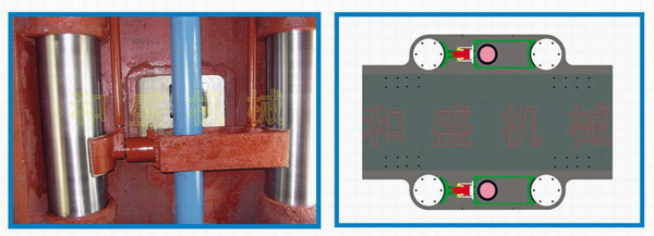 ?4:升降導柱與中座接觸面采用表面軋制美國杜邦“聚四氟乙烯”聚合物材料的導套;導套表面軋制成圓形儲油坑,在少油或間隙斷油條件下能正常工作,具有摩擦系數(shù)低,耐磨性能好,使用壽命長等優(yōu)點。