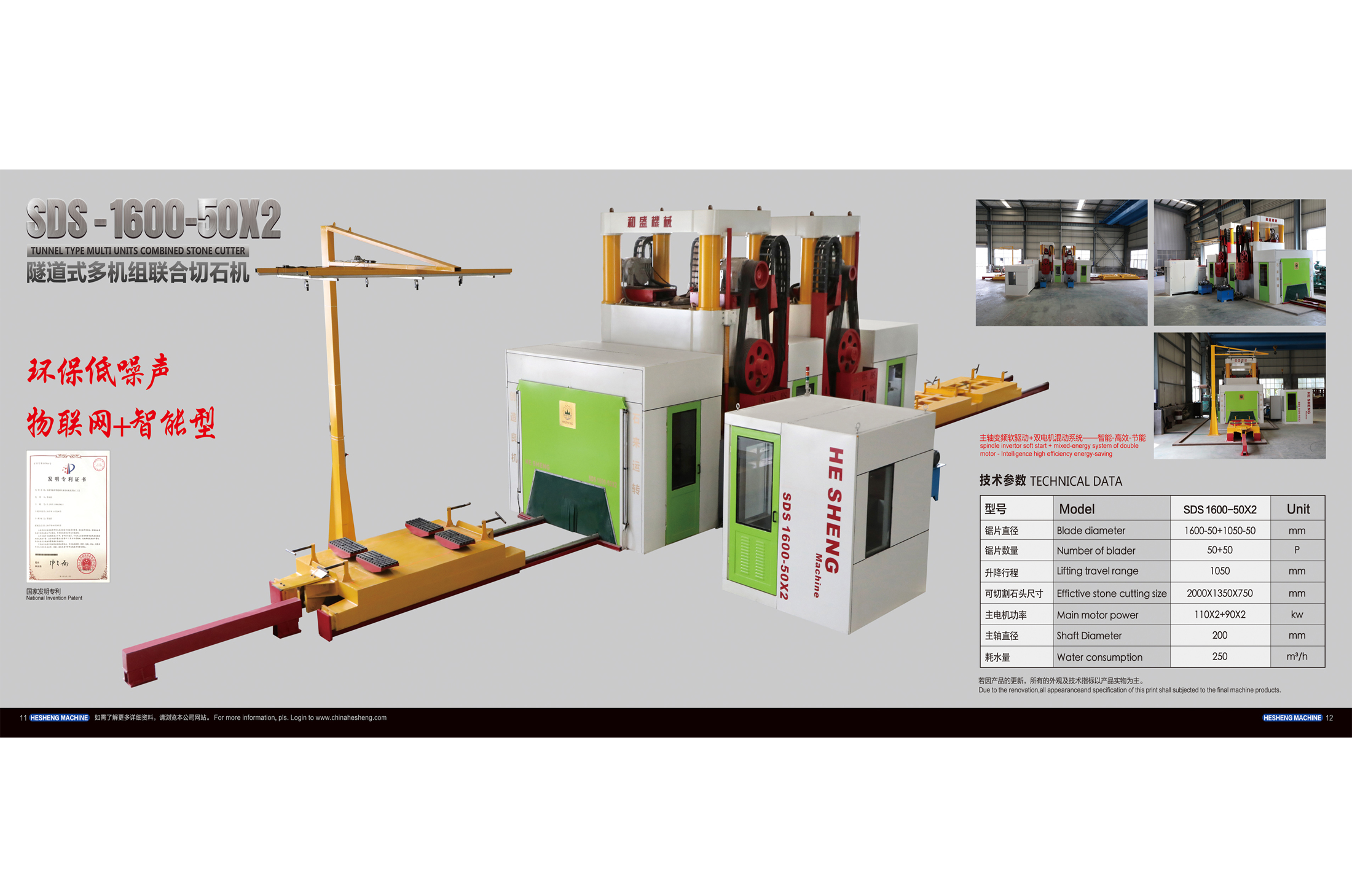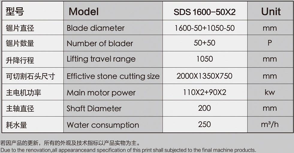 SDS-1600-50X2 隧道式多機組聯合切石機是一種免建廠房可直接安裝于礦山上的石材加工設備??s短建設周期,提高投資效率;可大大降低石材廠投資成本。該設備為流水線生產方式,鋸片采用同直徑為一組,鋸片直徑從小到大的階梯分布方式。每組鋸片只負責切割一小段,這樣切割可有效減少斧頭板、彎板、斜板等的產生。 整機采用封閉式箱體結構,大大減少了石材加工過程產生的噪音及粉塵污染。并在箱體內部分布多個監控攝像頭,監控切割狀況;并且可實時聯網進行監控操作。